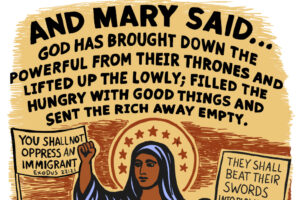 The words on the front of our Christmas card this year are taken from a song, traditionally referred to as the Magnificat, sung by a pregnant Mary of Nazareth, mother of Jesus (Luke 1:46-55). Her stirring words echo other women in Jewish tradition—especially Miriam, Moses’ sister—who sang of the compassionate, liberating action of God on behalf of the poor and oppressed.